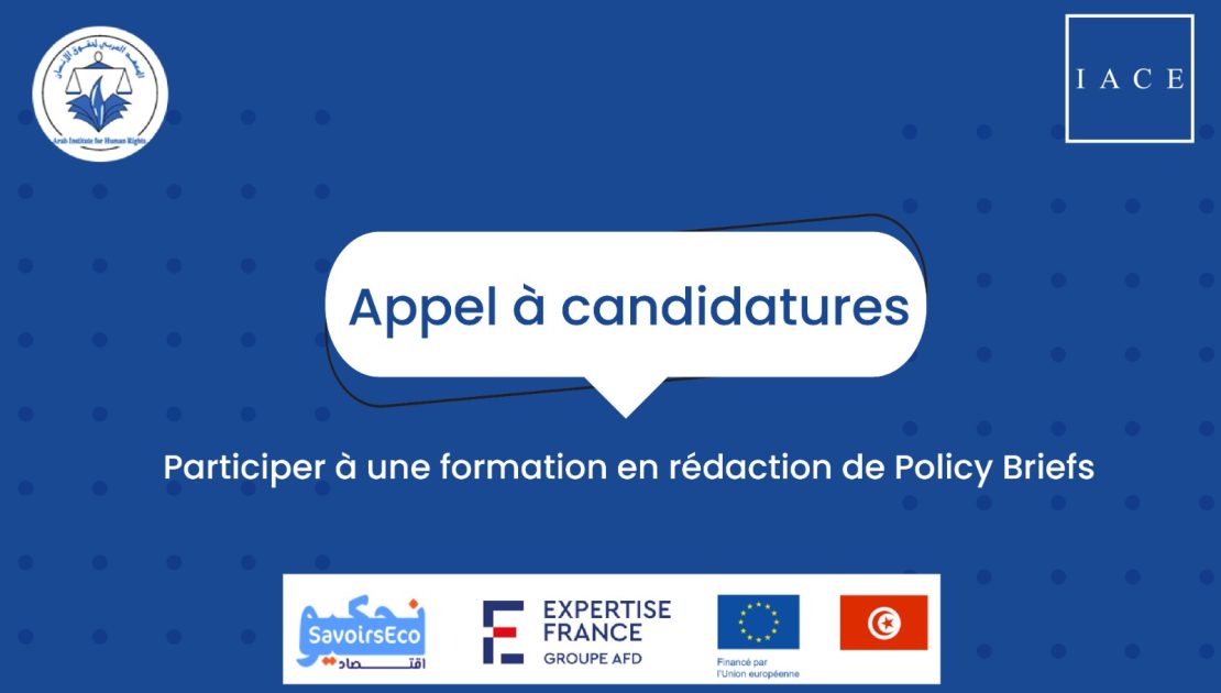 Dans le cadre du projet Ecotous et dans le but de renforcer les capacités de vulgarisation des producteurs du savoir économique et les aider à simplifier et diffuser leurs travaux de manière accessible, l’IACE lance un appel à candidatures pour participer à une formation intitulée “Rédaction de policy briefs pour la prise de décision stratégique”.