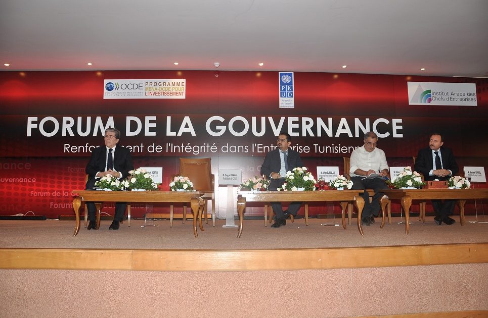 Le Centre Tunisien de Gouvernance d’Entreprise (CTGE), relevant de l’Institut Arabe des Chefs d’Entreprises (IACE) a organisé, en collaboration avec le Programme des Nations Unies pour le Développement et l’Organisation de Coopération et de Développement Economique (OCDE), le jeudi 24 octobre 2013 à la Maison de l’Entreprise-les Berges du Lac, la 1ère édition du Forum de la Gouvernance sur le thème :